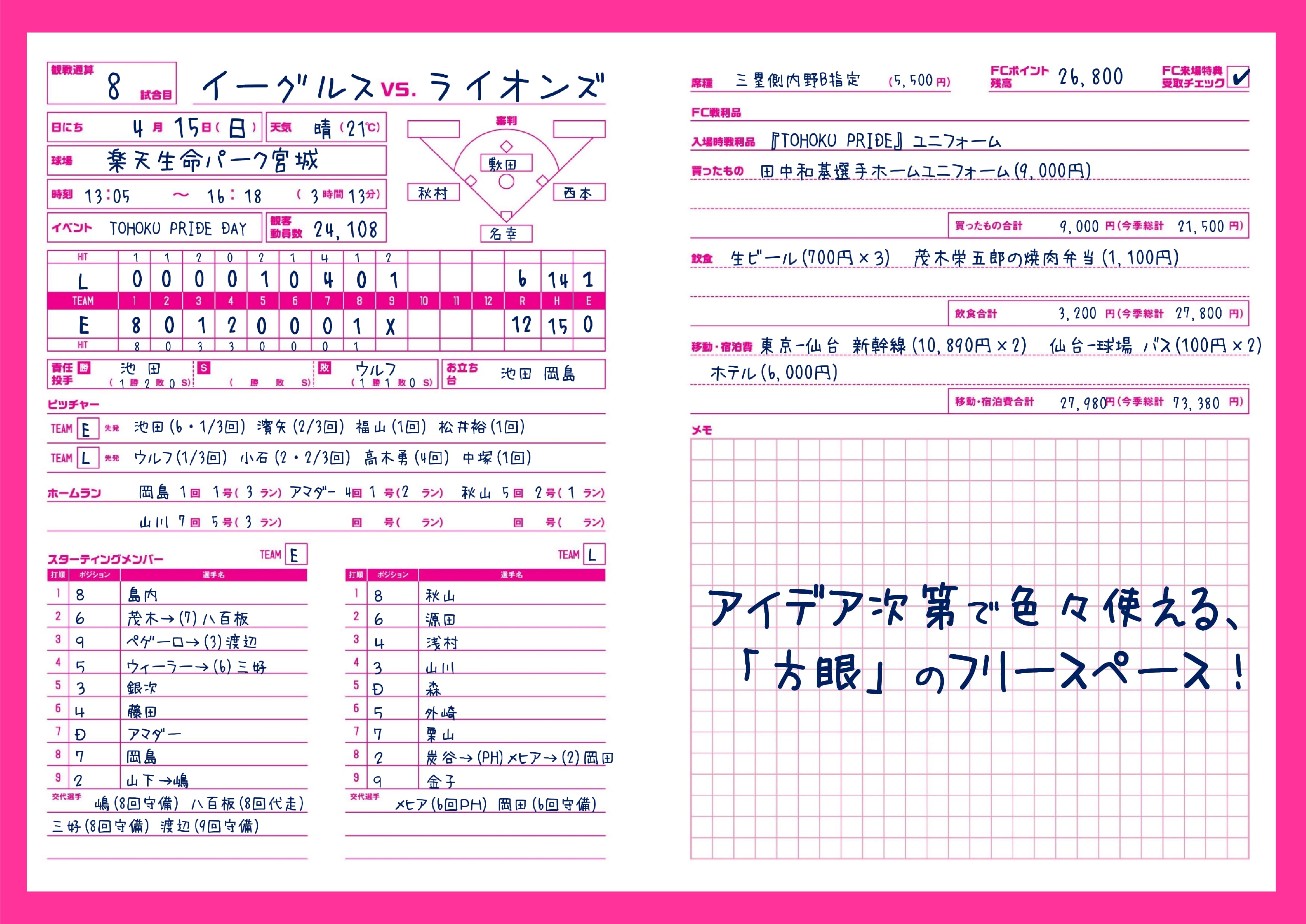 スコアや選手の動きなどの試合データはもちろん、球場内外で使ったお金の管理や食べたもの、買い物の記録まで、これ1冊であなたの野球観戦ライフを丸ごとメモリーします!